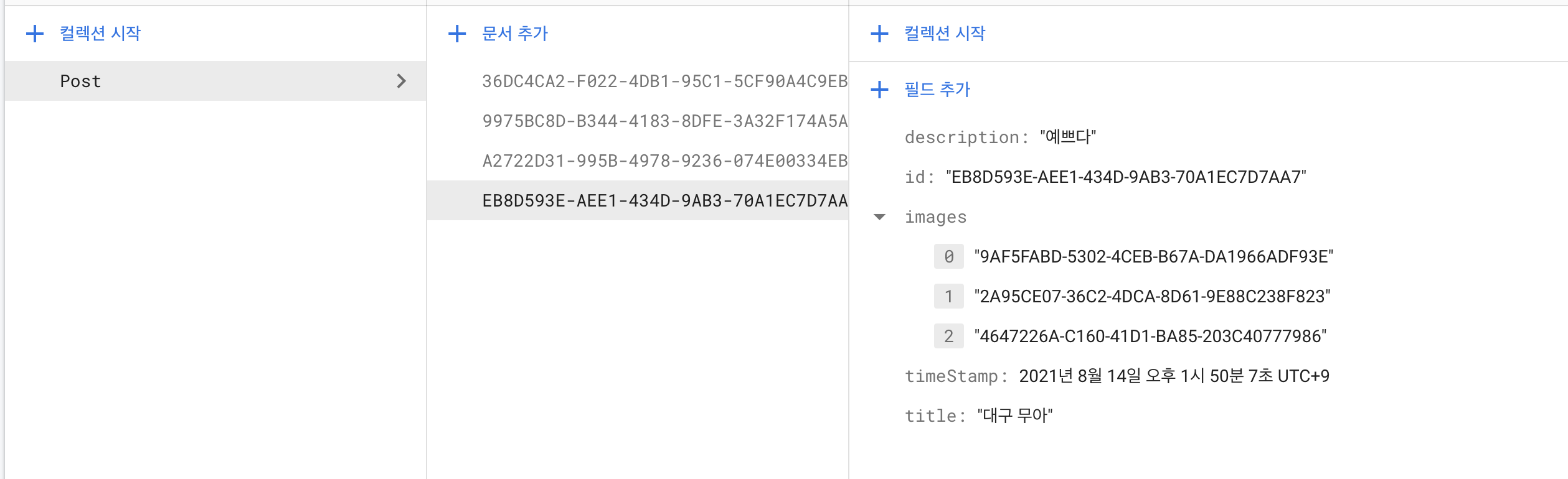 하지만 Firestore을 통해서 사진을 업로드하는 방법을 찾다가 애초에 사진 등의 용량이 큰 데이터를 저장하고 관리하는 db가 아니라는 사실을 알게되었다. 그래서 사진은 storage에 저장하되, 사진의 이름을 id로 만들고, 그 id를 db에 저장하여 참조하는 형식으로 만들기로 했다. 그러기 위해 일단 firestore에 "Post"라는 이름의 "컬렉션"을 생성해준다. 여기에 하나의 게시물을 하나의 "문서"로 만들고 그 안에 필드들에 제목, 설명, 이미지 id 등의 속성을 저장한다.